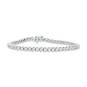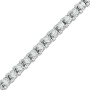 Crafted in cool 10K white gold, this stunning bracelet features an interconnected square frame with sparkling round diamonds set into each prong. The diamonds weigh a total of 4 carats and are polished for a mesmerizing sparkle. This unique bracelet measures 7.0 inches long and secures with a tongue-and-groove clasp.